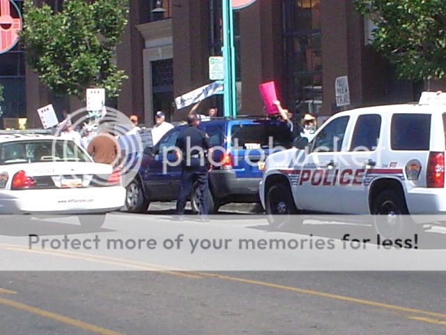 At about 10:30 AM, an APD sergeant (vehicle #J255, NM license plate G-74937) arrived at the scene and started talking to various protestors. As time went on, six other officers arrived. At no time were any of the protestors blocking traffic or any of the building entrances.